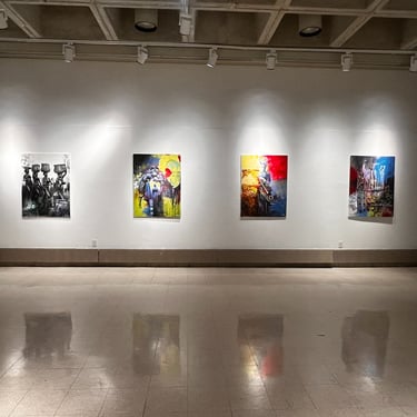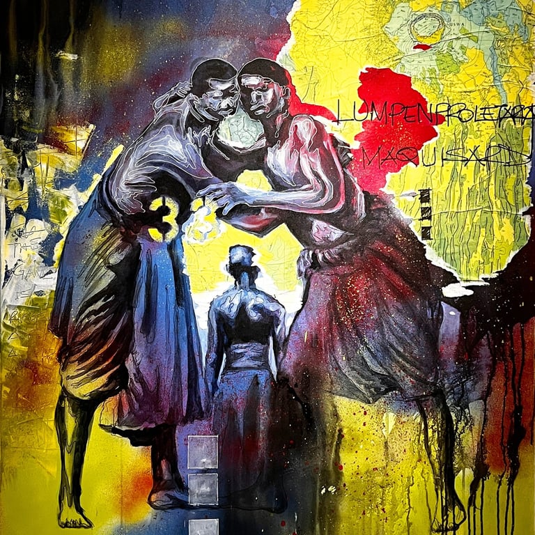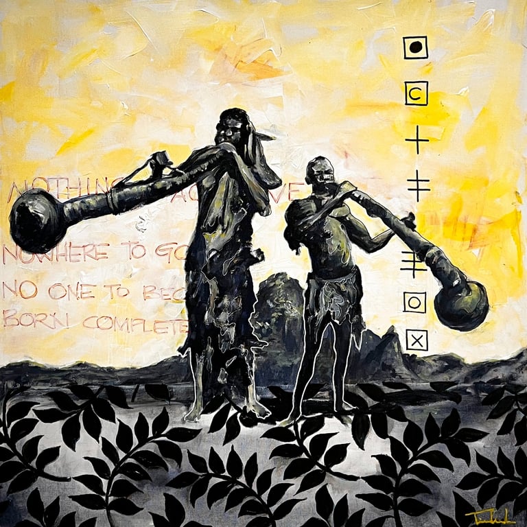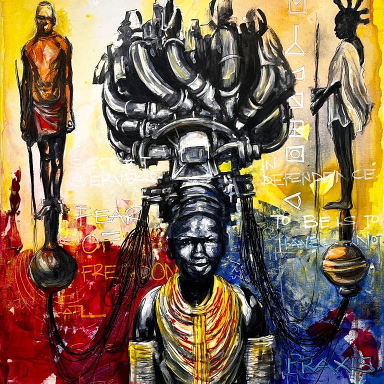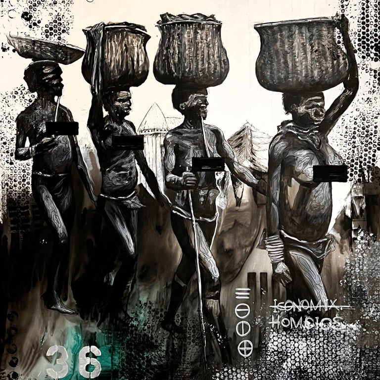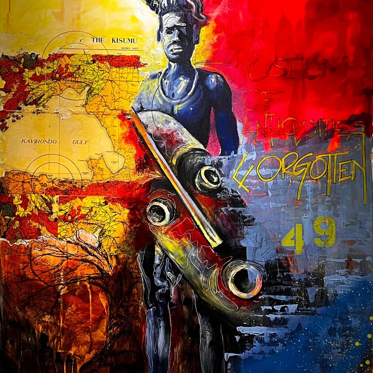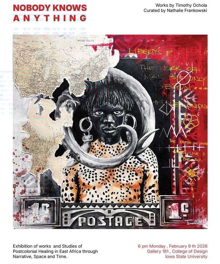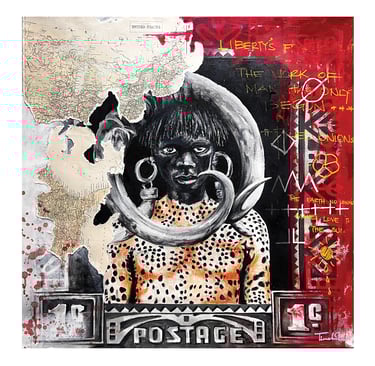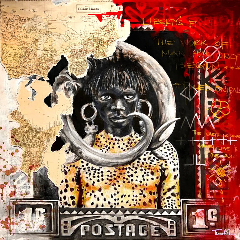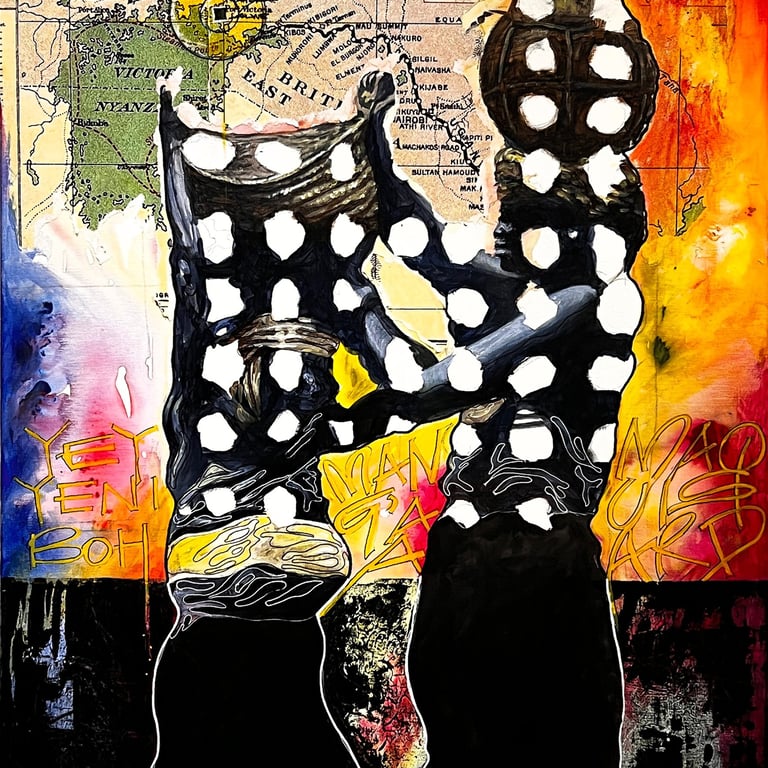 The accompanying paintings and collages integrate human figures, often abstracted, fragmented, or layered, within precolonial maps, stamps, symbols, and text. These figures embody the oppressed persona: silenced yet enduring, constrained yet resistant. Positioned within distorted cartographies and archival marks, the bodies reclaim space and agency, transforming colonial records into counter-narratives. Together, the research and artworks frame architecture and art as embodied acts of resistance and healing, where land, memory, and the human figure converge to imagine liberated African futures.